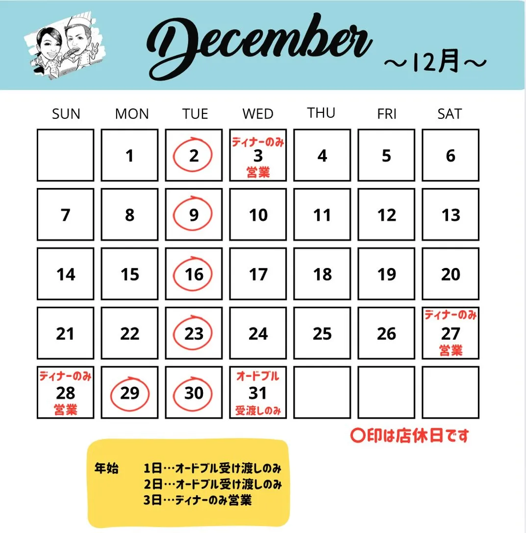 明日から12月🫶🏻 明日から12月🫶🏻12月の店休日です!!年内ランチ最終日は26日ディナーは28日となります。お弁当、オードブルのご注文次第でランチオープン時間など変更になる場合がありますのでインスタにてご確認おね…